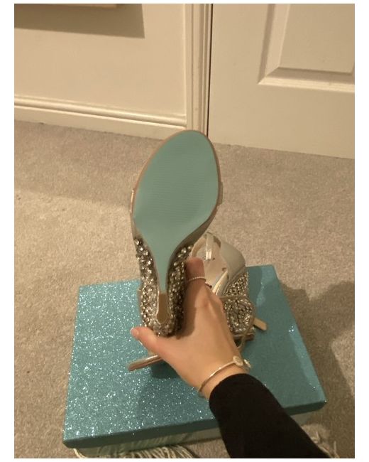 These are the beautiful silver Alisa wedge sandal from the Blue by Betsey Johnson range. You can no longer buy these and I had to order them from America. They are even more beautiful in person abs the heel is embellished with pearls and gems. They also have a blue bottom for your something blue. They are brand new, have never been worn only tried on. Due to changing my wedding because of COVID they are no longer needed. Originally cost me £120. Size 3 and true to size.