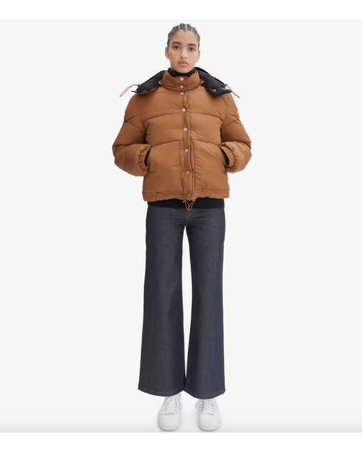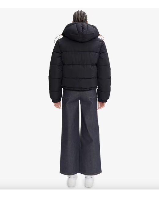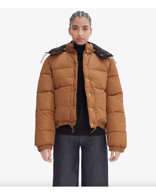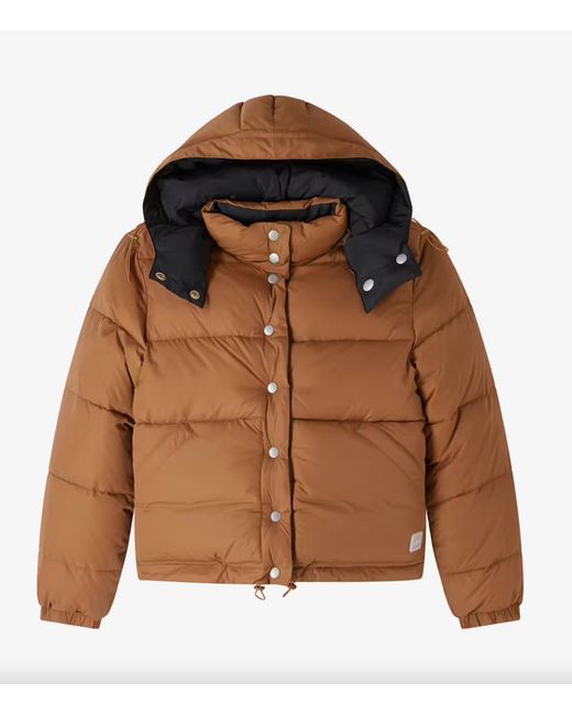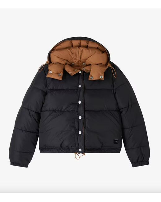 Removable hood with drawstrings and stopper, and a high collar with snap buttons. Elasticated wrists. Drawstrings with stoppers at the bottom. Silicone A.P.C. patch on lower left.