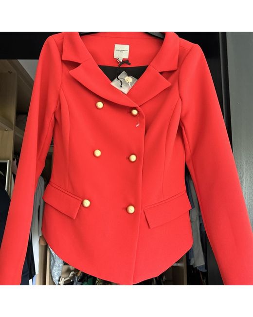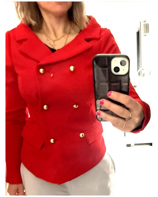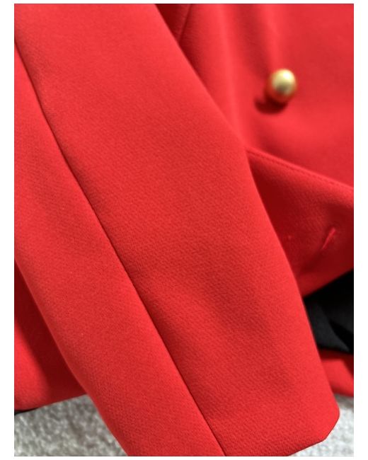 This ladies' jacket made by Silvian Heach design is the perfect addition to your wardrobe. Made of a polyester and elastane blend, it features a collared neckline and button closure. The jacket has a slim fit and is perfect for travel, casual outings, or formal events. It has pockets, long sleeves, and is lined with polyester. The jacket is suitable for all seasons, making it a versatile piece of clothing. The bright red colour adds a pop of colour to any outfit, making it a great choice for outdoor activities or classic looks. The jacket is available in XS size and can be dry cleaned only. Stunning brass buttons is fitted looks snug and pretty as womanly shaped. Pillar box RED and has tags unused item xx pls ask questions ❤️❤️❤️❤️❤️