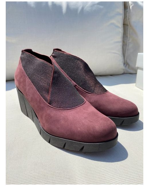 The wedged shoe is in a beautiful rich bordo nubuck with a very stylish and easy to enter elastic wrap over the instep. The shoes are really lightweight and super comfortable.