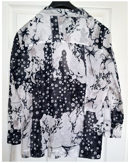 Peter Martin Thin Unlined Jacket, Cotton Material, Collared With Slightly Flared Cuffs In A Black & Grey Floral Pattern On A White Background, Very Pretty.