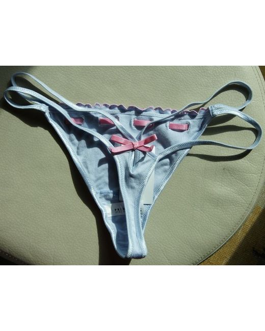 The leg sides are edged with shiny blue elastic which is held in place with zig zag stitching in blue. There is a pink satin elasticated ribbon bow at the top of the keyhole of the thong stem. A fine band of blue elastic stretches between the two string sides under the front panel.