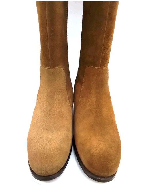 Made from a streamlined suede and leather silhouette moulds comfortably around the leg and a small heel to elongate your look. These boots are different shades of brown, due to sunlight fading on the right boot from being on display .