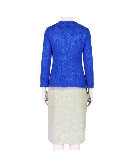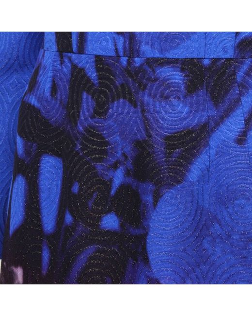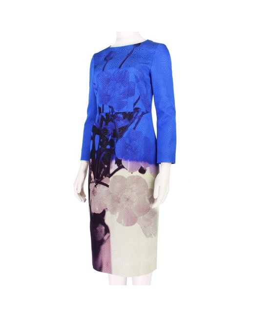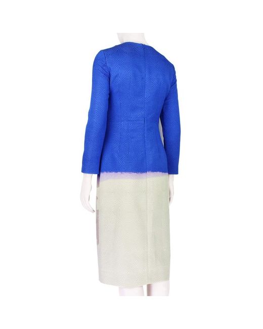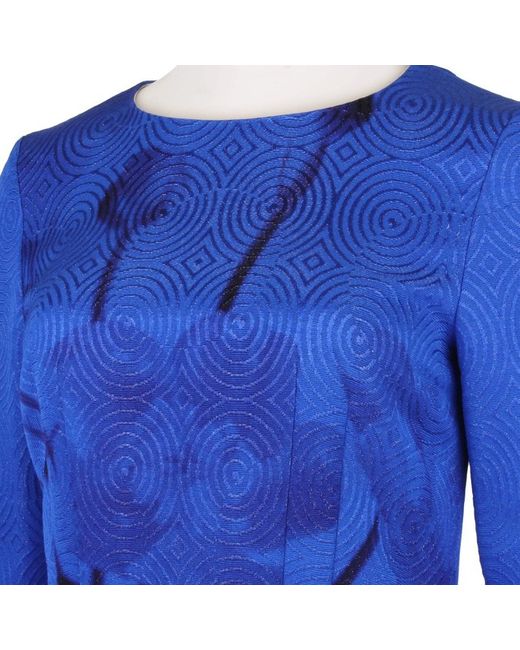 Dries Van Noten luxurious dress in an abstract floral pattern. A slim fitting dress in a textured concentric pattern. Colour: Royal blue, purple tones and taupe. Slim fitting long sleeves. © Renascence.
