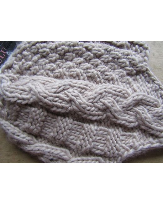 Soft beige chunky acrylic knit, chunky pattern to knit, flaps to ears with plaited tasselled ties to ends. Measures = 9" Length (top of hat to base), 10" Width (across bottom unstretched)