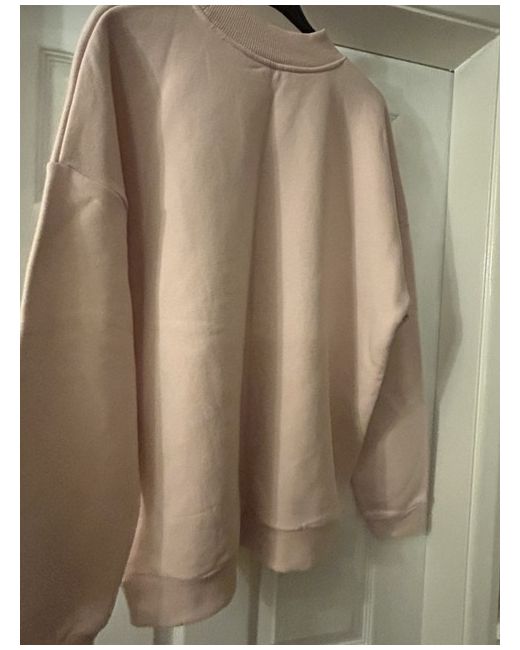 This is a new pink jumper by Tee and Cake at Topshop, in size 14 for women. It features a high neck and a pullover style with a slogan design.