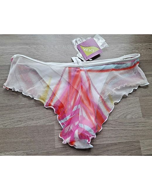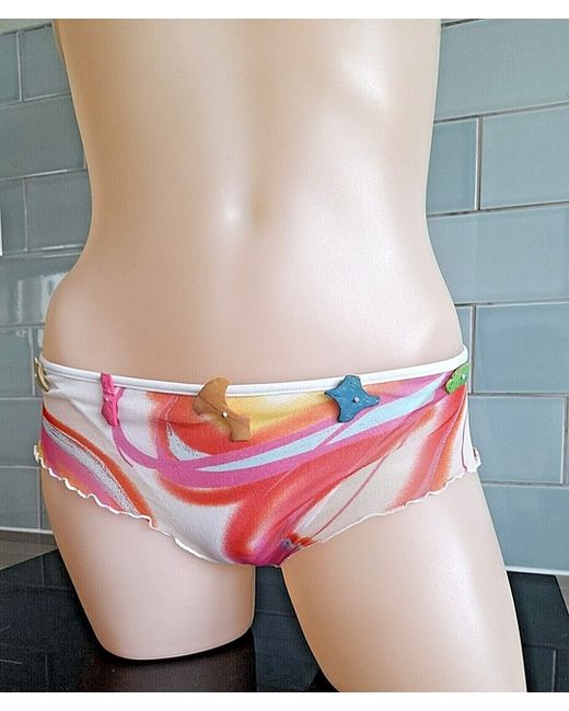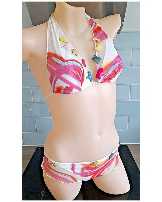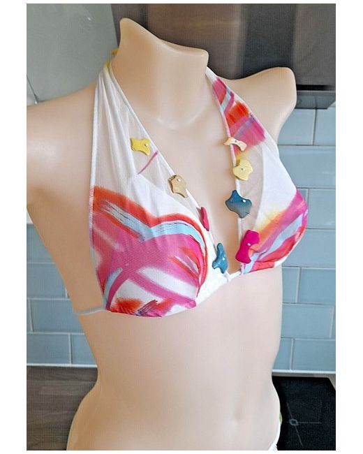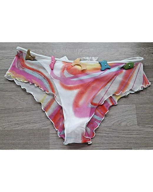 Both the bikini top and the culottes have a printed pattern of modern art in colours of pink, red, orange, yellow, pale blue and lilac printed onto ivory white tulle which feels soft and delicate. Both the bikini top and briefs are adorned with what looks like shards of ancient bone, of different colours, sewn onto the fabric and secured with a tiny pearlised bead in each single hole.