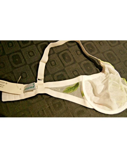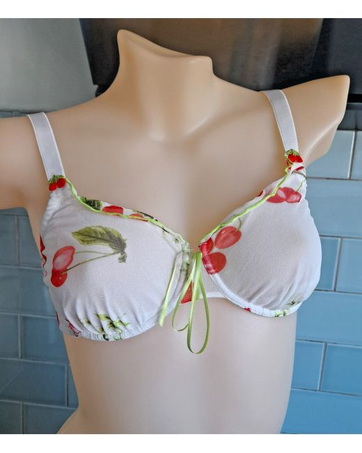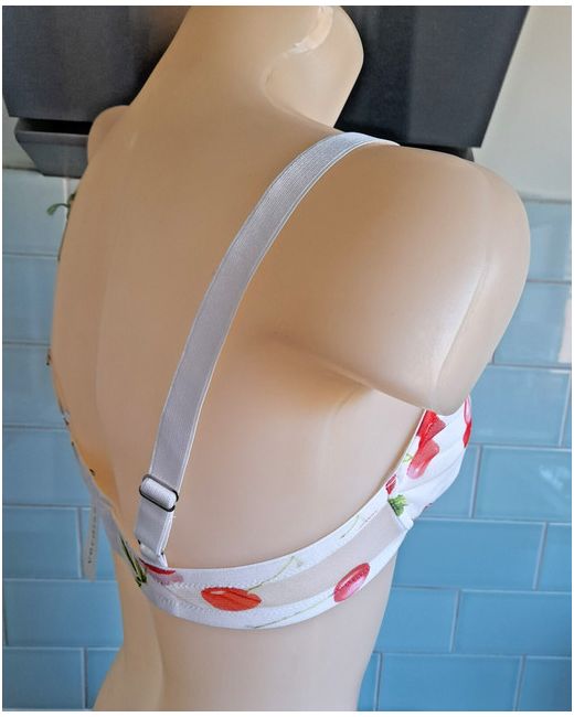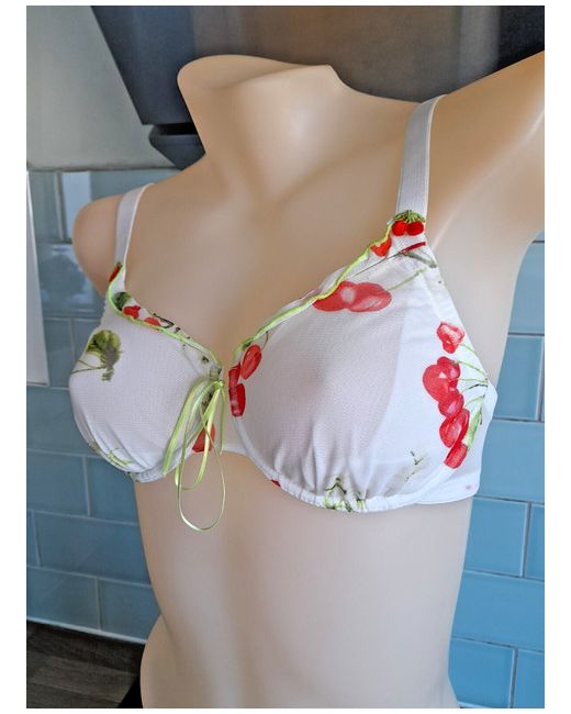 The sides and back are in the sheer white cherry patterned tulle with the top and bottom edged inside with white elastic with a fine edge to it. The bra fastens with three rows of white double hooks and eyes on white fabric.