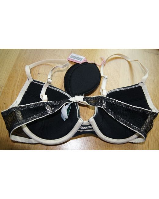The bra fastens with three rows of single beige hooks and eyes on cream fabric. The fabric is made of: 45%Cotton 35%Polyamide 20%Elastane. The label says it may be machine washed or hand washed at 30 degrees, line dry, iron on cool, no tumble drying or dry cleaning.