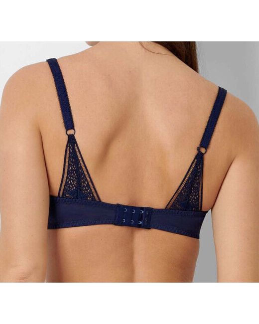 Sans Complexe Baiser Vole Marine Blue Bra. A beautiful navy blue foral lace over a nude lining. Two hook and eye fastening with four positions.