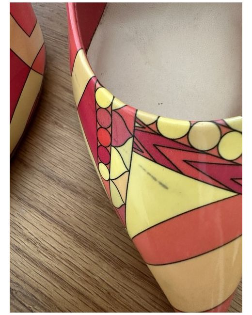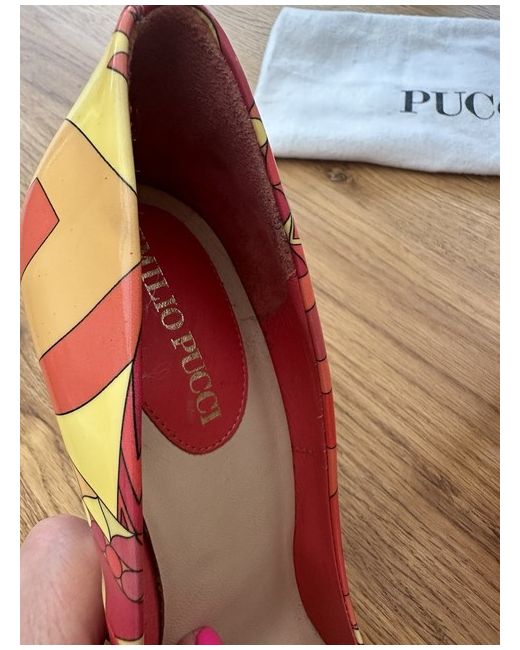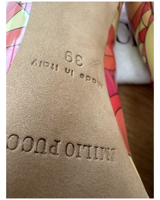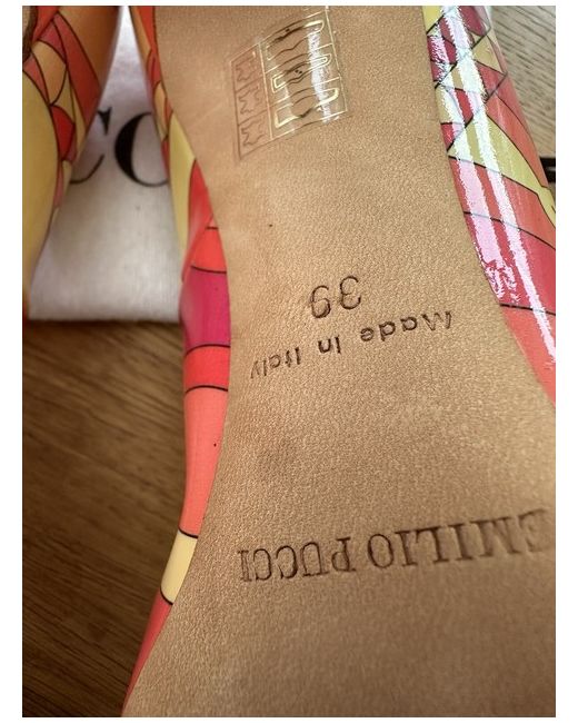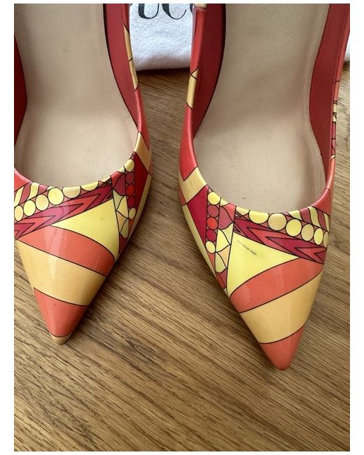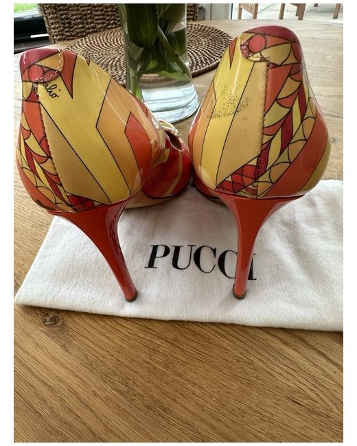 Authentic Emilio Pucci heels purchased by me from the Pucci boutique in Caesar’s Palace Las Vegas. They have never been worn however do have some marks on from when I sent them to a consignment store. The owner insists it was just from trying the shoes on in the shop, so please check the photos before purchasing They are an orange cream pink coral colour. Smoke pet free home size 39. Leather upper insole and sole. Patent leather.