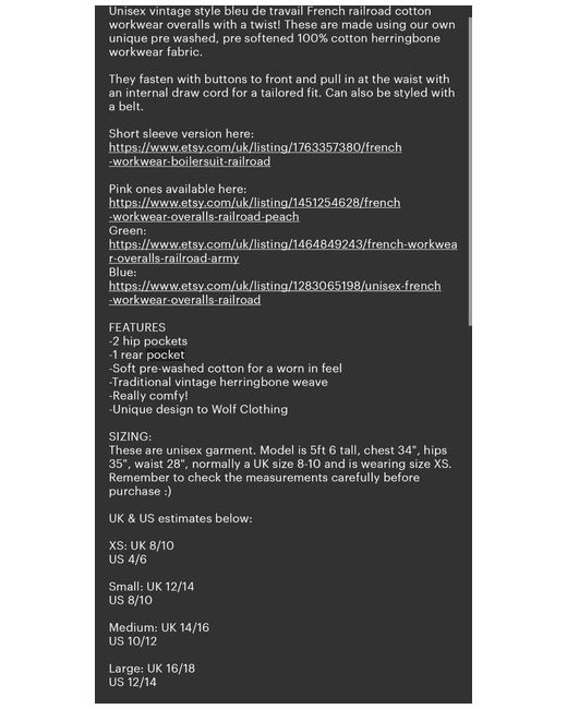 Wolf clothing french style overalls in black herringbone cotton. Worn once but selling as I need to size up, would better fit someone size 8/10. Orignal description and sizing included with pictures. No returns or refunds.