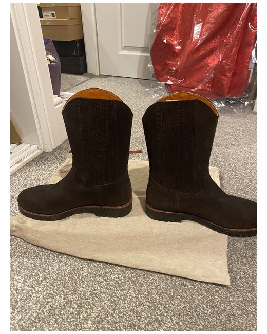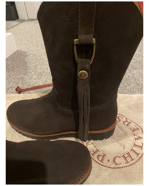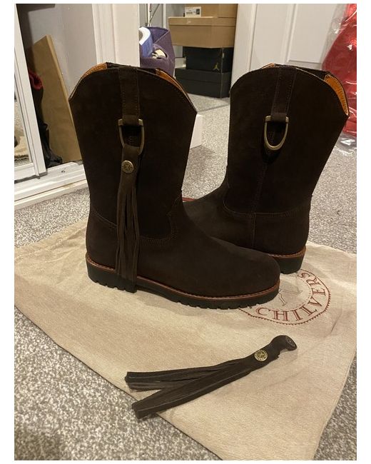 Penelope chilvers chocolate brown suede leather Brand new with dust bag western style mid calf boots Cowboy boots with detachable tassels Sturdy soles Size uk 4.5 / eu 37.5 SPECS: Sustainably sourced Italian oiled suede upper from a gold-rated tannery as audited by Leather Working Group. Rubber sole. Made in Spain.