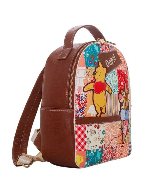 Featuring vibrant colours and patterns contrasting with a neutral brown trim. Pooh is found on the front of the bag, while his friends peep out from behind the pattern. Get ready to adventure through the Hundred Acre Woods with all of this cuteness!