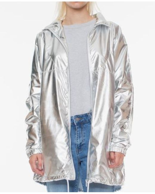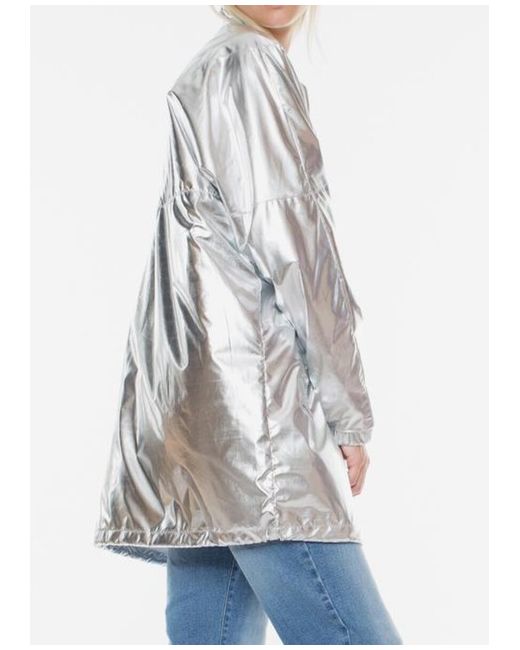 Oversized jacket with front zipper, drawstring at the bottom and two buttoned side pockets. Light material in a shiny silver finish. 100% polyester.