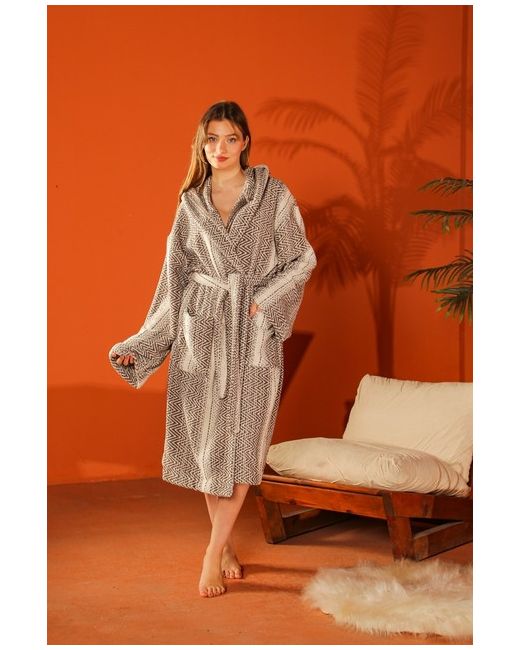 🧖♀️ Crafted from soft, absorbent towelling fabric. Wrap yourself in a sense of calm with this beautifully woven cotton bathrobe. The beige and brown zigzag pattern adds a modern yet cosy charm, evoking the earthy tones of a peaceful morning.