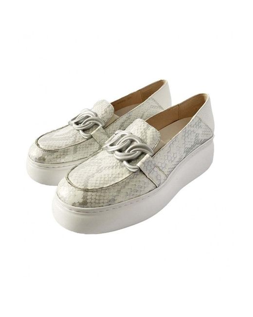 Snake Print. Silver chain detail. Two-tone white and grey leather wedge moccasin.