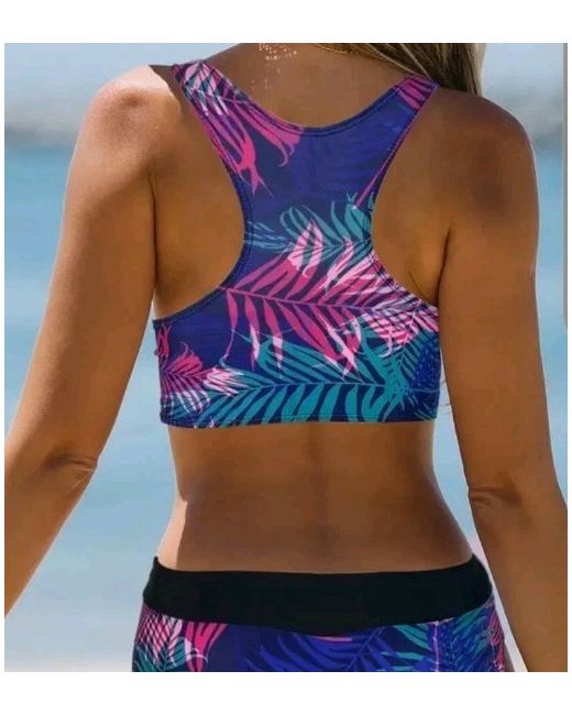 This stylish black and purple palm print bikini is perfect for any beach holiday or tropical getaway. The athletic swim top style and high-waisted swim bottom style offer a flattering and comfortable fit, while the racerback strap type adds a touch of elegance. The bikini is made of a stretchy polyester and spandex material, with a padded and lined design for added comfort. Hand wash only to keep it looking its best. This two-piece set is perfect for women who want to make a statement at the beach or pool.