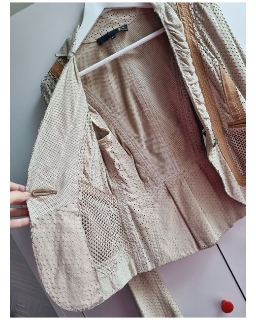 This statement piece is a vintage Cavalli leather jacket in beige, featuring a unique perforated design and slit sleeves with button accents. Made in Italy, it has a slim fit and is size IT 40 (UK 8). This limited edition jacket also includes pockets and is breathable, ideal for wedding, party, casual, formal, or workwear occasions.