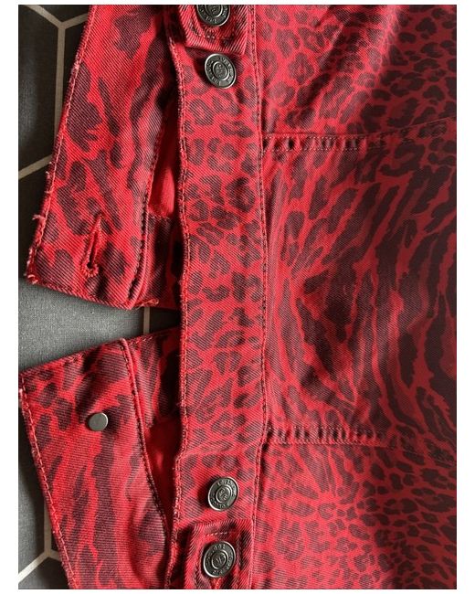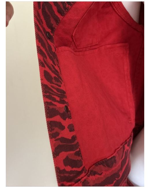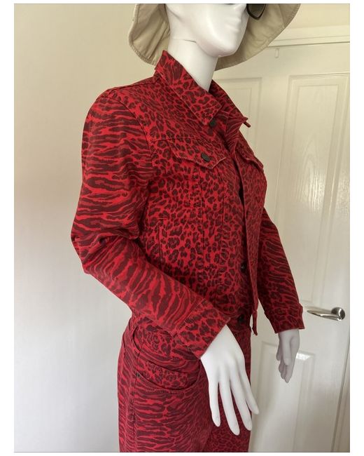 This Current/Elliott denim jacket features a bold red and black animal print pattern, giving it a striking and edgy look. The pattern adds a fashionable twist to the traditional denim style. - Chest (pit to pit): 47 cm.