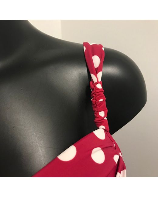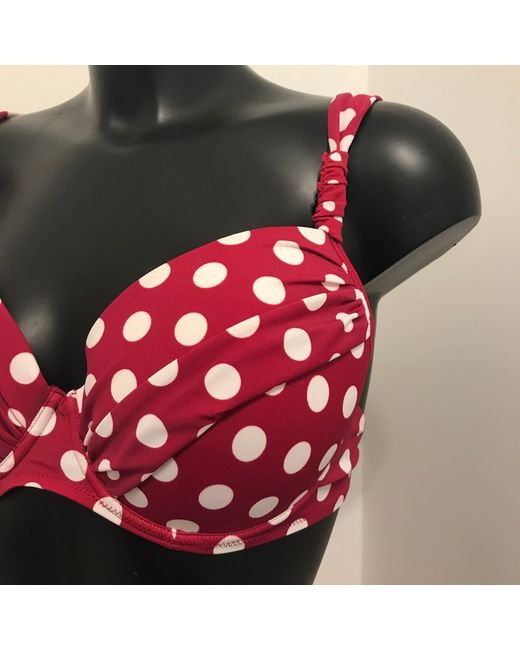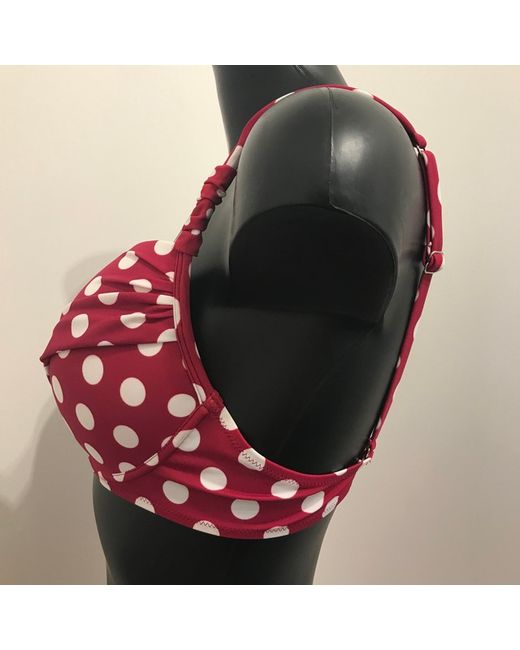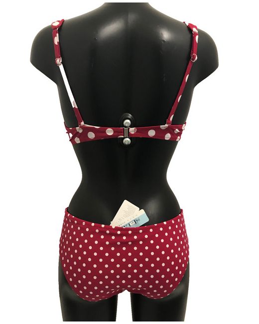 Top = UK 36D, USA 36D, ITA 3D, D/EUR 80D, F/E 90D. A vibrant red and white polka dot bikini perfect for the beach or pool. Complete with matching bikini bottoms with good rear coverage. Sielei Designer Cannes Bikini Set.