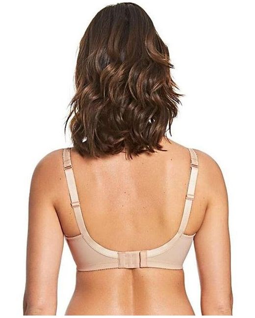 The beige bra features a bow accent and a hook and eye closure. The bra is designed with a normal strap and a full cup cup coverage. It is also washable and can be hand washed for easy care.
