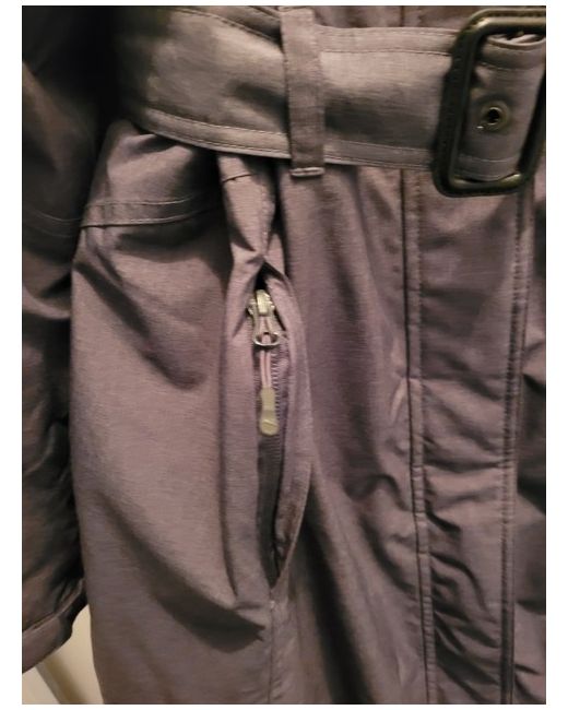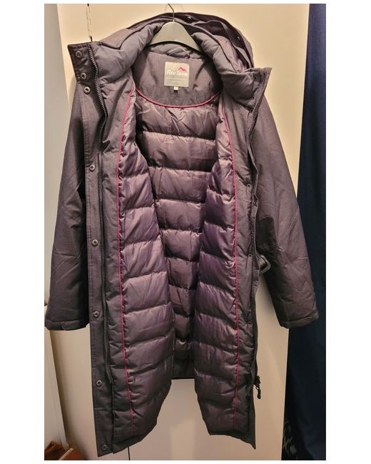 This Peter Storm Parka is a grey coat for women, size 16, measuring appx. 98cm from babk of neck to hem. It has secret ribbed cuffs and features a fly front zip closure, as well as zipped pockets, a hood and a buckle belt. The parka has polyester insulation for winter and autumn seasons, with an outdoor theme.