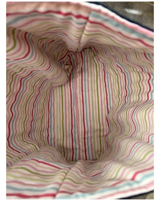 Handmade padded denim tote bag with a patchwork front panel. Maroon cotton webbing handles and boxed bottom, fully lined. Totally unique, one only!