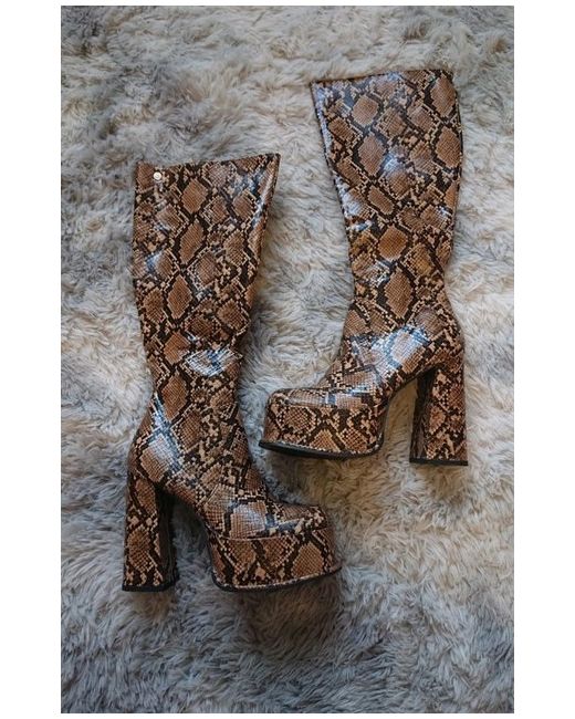 New & Unused Shellys London faux snake skin knee high platform boots UK size 5 These boots are just amazing.... Originally purchased from Urban Outfitters for £70 Boots have a chunky platform heel and sole and fasten at the side with a zip Heel height is 13cm, Man made vegan material. Boots will be sent in the original box which is a bit tatty from being in storage. Boots are pristine tho Check out my other items and save on postage with a bundle x