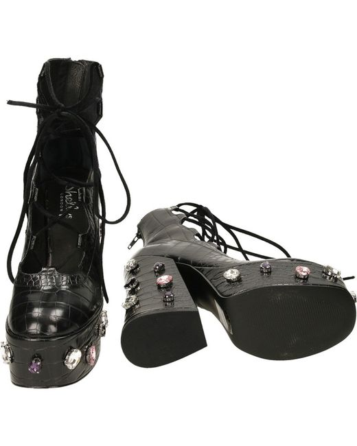 Ladies stunning ankle boots by Shellys London. Farrah by Shellys London. Enhanced with a faux leather upper with croc pattern. Croc pattern. Pretty array of different coloured gemstones around the heel and platform of the boots.