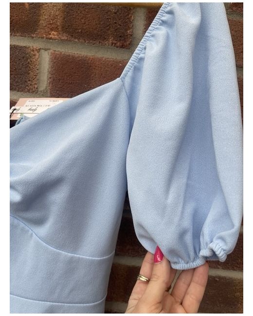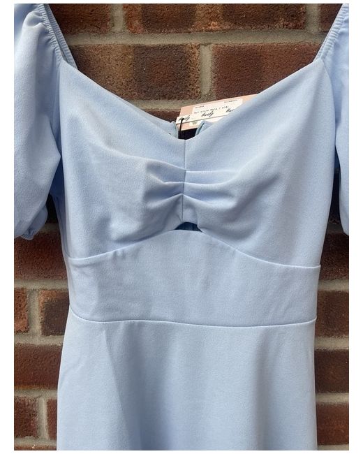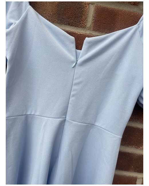 This is a WalG women's dress in size 12. It is sky blue in colour with a fit & flare style, short sleeves, and is made of polyester. The dress is knee-length, suitable for regular-sized women.