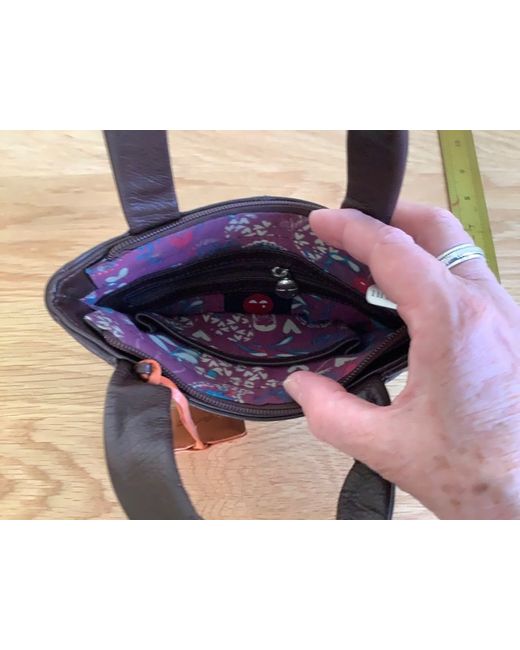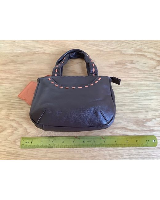 Mini Yoshi Grab bag made of soft chocolate brown leather with an orange detail. 18cm wide, 13cm high 4cm deep at base.