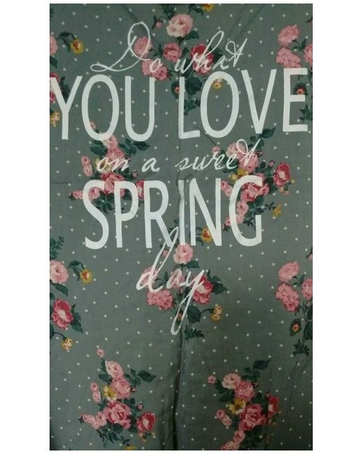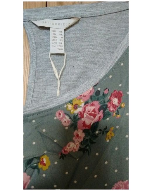 Sage green and white polka dot spotted with Cath Kidston style pink and yellow flowers print. Plain grey sleeves and back. Size USA 8 which is UK 12.
