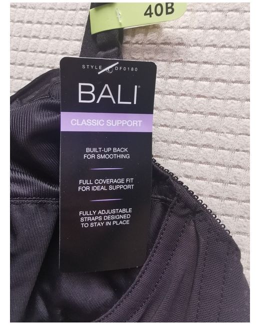 Elevate your lingerie collection with this classic support bra from Bali Intimates. Designed to provide full coverage and a perfect fit for women, this bra is a must-have addition to your wardrobe. The black colour adds a touch of elegance to the design, while the size 40B ensures a comfortable fit. The bra features a range of desirable aspects including a classic style, full coverage, and support. The brand Bali is highly regarded in the lingerie industry, ensuring that you are purchasing a quality product. Suitable for everyday wear, this bra is perfect for any occasion. Brand New. Item nr 490/19(0.64)