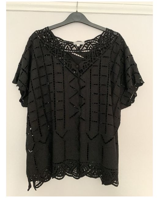 ‘Dressy’ black top with cut outs. V neck with covered buttons down the front. Cut out effect can be seen in photos when shown over a red cami. The top is not sequinned - the light catches the embroidery in the photos.