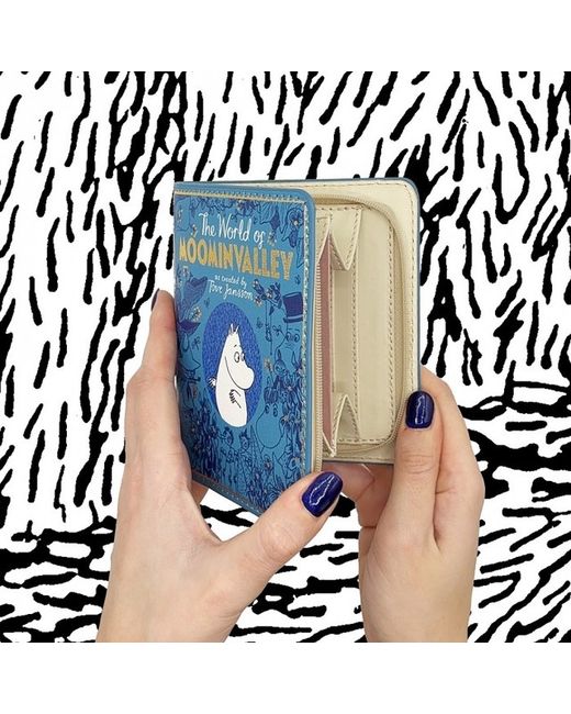Moomin Blue Book Wallet. 100% official Moomin product. Features printed details and a cotton lining. Measures 13.5cm x 10.5cm x 2cm (approx). Zipped opening with 4 card slots and two pockets. .