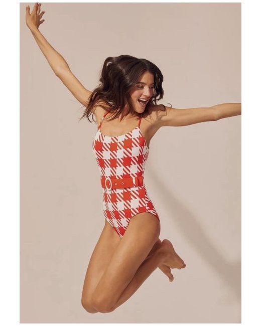 Step into the season with the Solid And Striped Belted Nina Swimsuit, a charming one-piece that's as functional as it is fashionable. Crafted in a vibrant orange gingham pattern, this swimwear piece pays homage to the iconic 60s theme with a modern twist. The belted feature cinches at the waist, offering a flattering silhouette for a size small. This swimsuit is made from high-quality polyester, ensuring durability and comfort during your water adventures. The design is part of the women's regular size range, making it a great fit for a variety of body types. Whether you're lounging by the pool or enjoying a day at the beach, this Solid & Striped swimsuit is sure to turn heads.