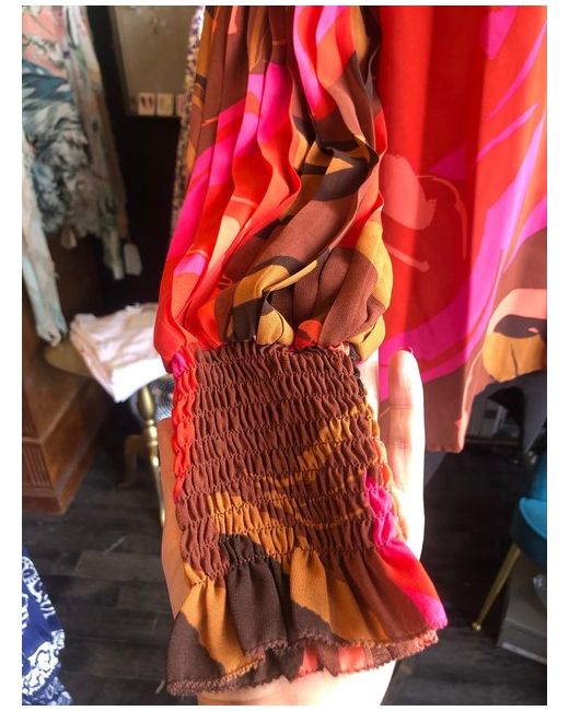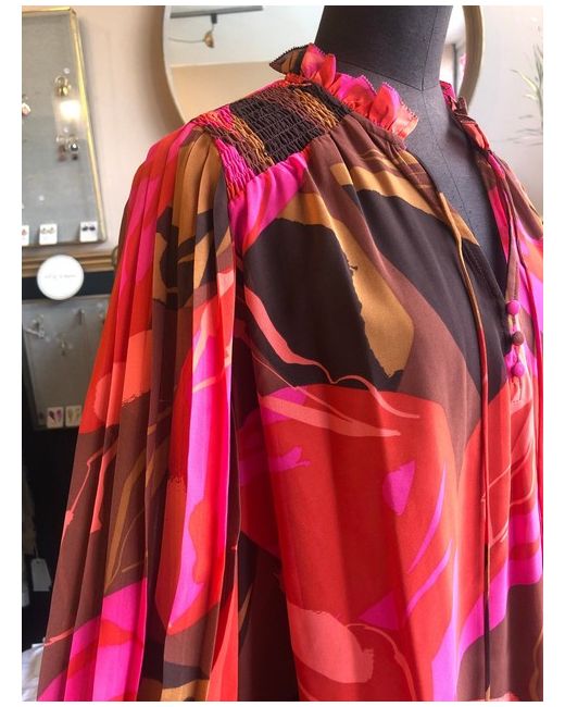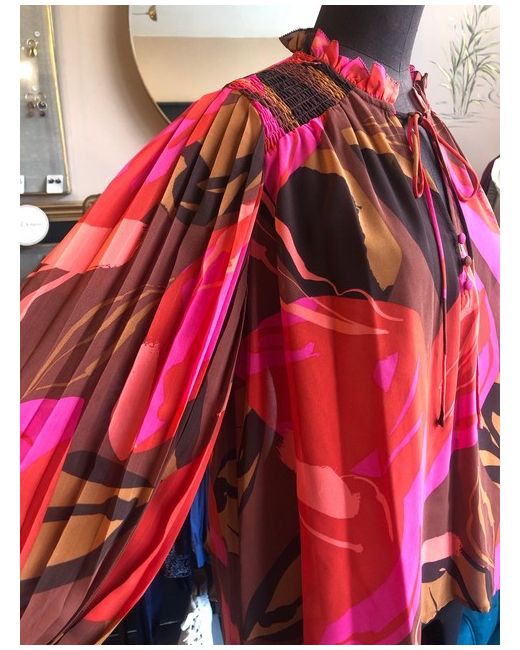 Fuchsia arty printed long dress in recycled polyester, wrap collar, long sleeves in see-through veil, tighten cuffs, elastic waistband, smocked shoulders, pleated skirt. Lined dress.