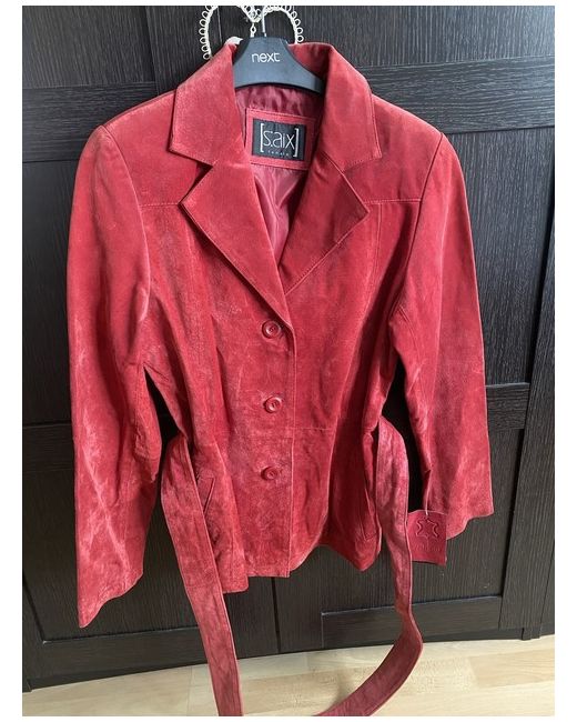 Lovely women’s bright red mid length suede leather jacket with buttons, optional belt and pockets- perfect for spring or summer! New with tags - just don’t wear it