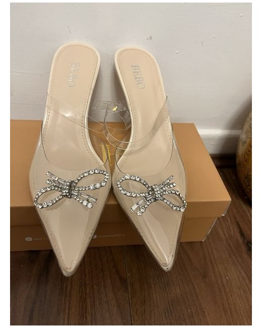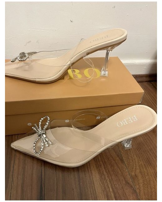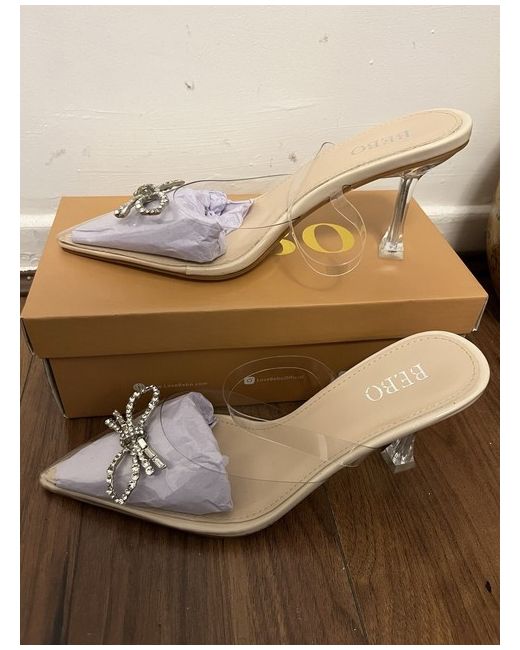 These women's shoes are a pair of clear, transparent mule heels with a stiletto heel style. They are a UK size 5 and are branded as Bebo. The upper material is made of transparent material, giving them a unique and trendy look. Perfect for adding a touch of elegance and style to any outfit, these heels are a must-have for any fashion-forward woman.