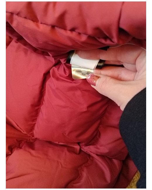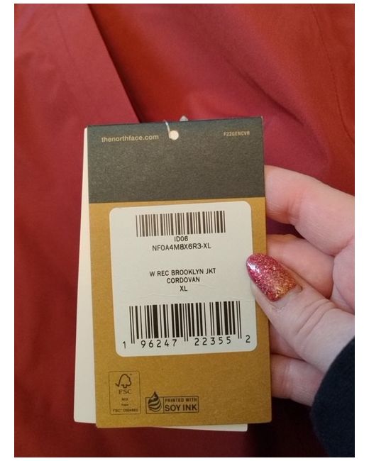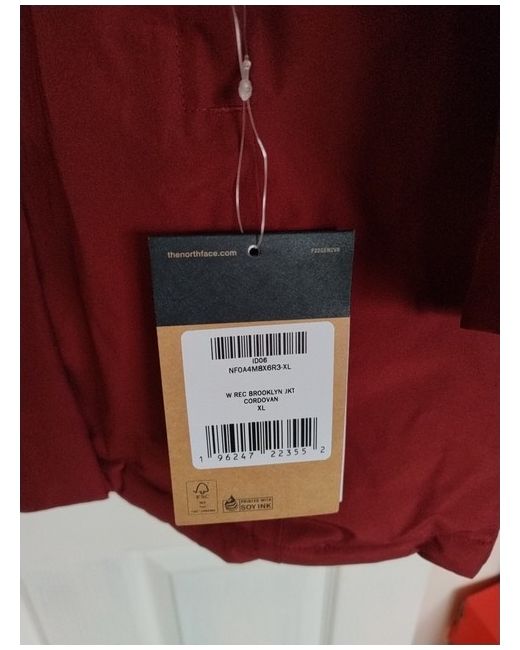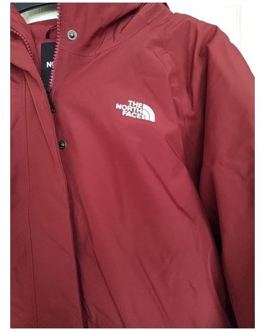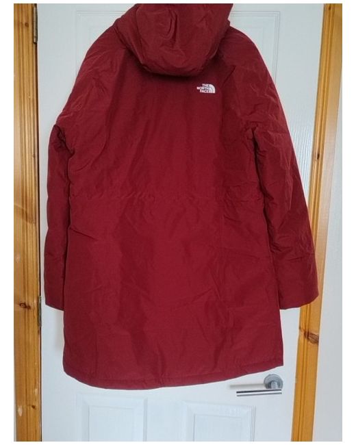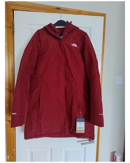 The North Face Brooklyn parka in cordovan red. The colour is "cordovan red" which I would call a rust/burgundy colour. I estimate no bigger than a size 14. There is a drawstring at the waist and also a hood.