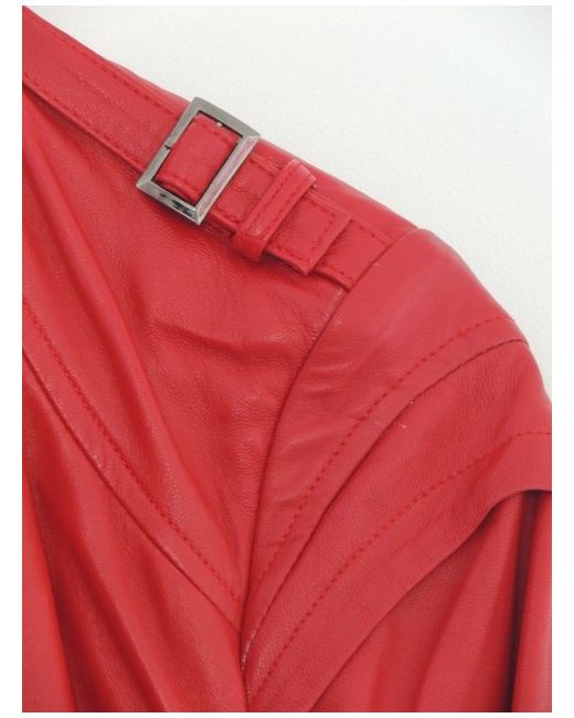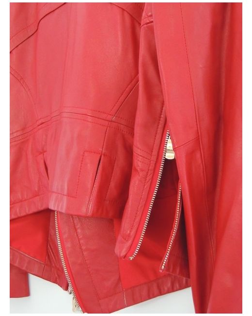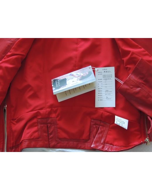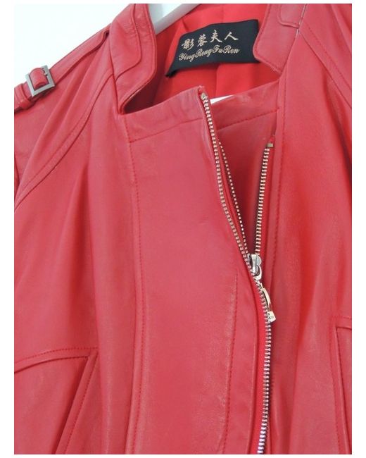 Genuine Red Calfs Leather; Fashionable biker jacket from "Ying Rong Fu Ren". Pure calf skin. This is a luxurious take on the biker jacket, rendered in mid weight, bubble red, soft calfs leather, closely stitched yoke, front and shoulder panels only enhance the young cows hide which is offset with pewter-tone shoulder buckle hardware.