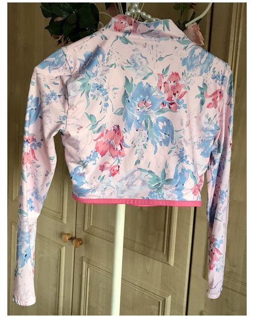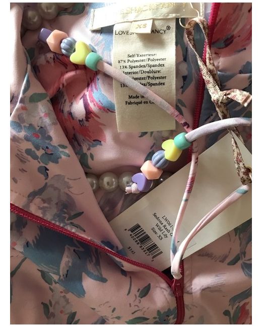 LoveShackFancy Jacket ‘Wild Lily’ Pink Floral Size XS. Condition is "New with tags". Cute little cropped jacket for beach cover up, festivals or over gym wear. Pretty beads attached to front zip. Very silky soft material. Lined body but sleeves unlined. Cuffs quite fitted and have zips. Front length is 13.5 inches and sleeve length from top shoulder to wrist is 20.5 inches. Dispatched with Royal Mail 1st Class.