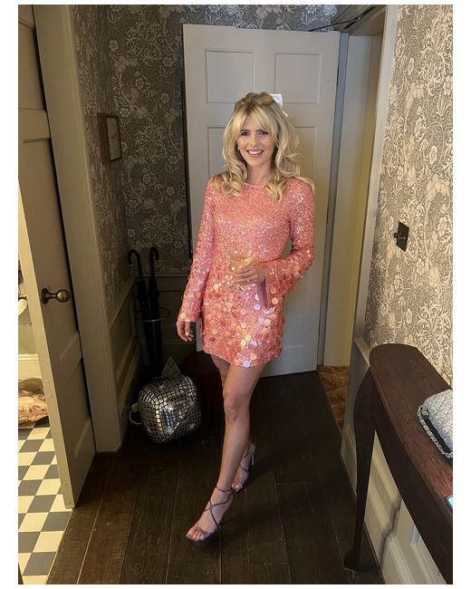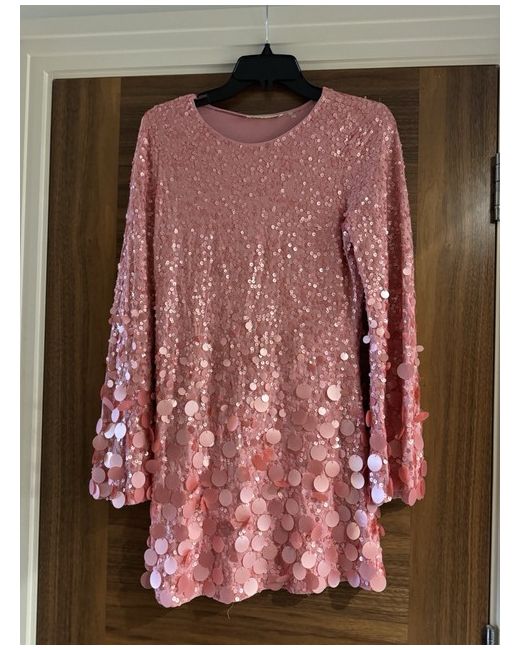 The sparkling pink mini is party perfection covered with large hand-sewn iridescent sequins that add the flirtiest shimmer when they dance along with you. Size XS - fits UK size 8 RRP - £600 The dress is self-lined and features bell sleeves and a slightly A-lined skirt. Perfect for all seasons ! Worn once for a hen party - perfect condition!