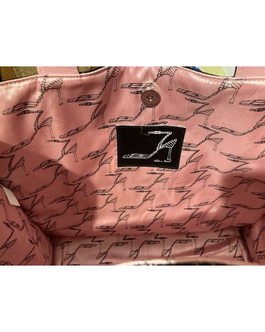 New large bag, black shiny faux leather with pink high heel shoe design on front & plain black on other sides. Base has 4 studs to keep base off the ground. Magnetic fastening. Lining pink polyester satin with back high heel design. Size - H 12.5” x W 15” x D 6.5” H 31.5cm x W 38cm x 16cm Length of handles - 18”, 45.5cm Will fit over shoulder