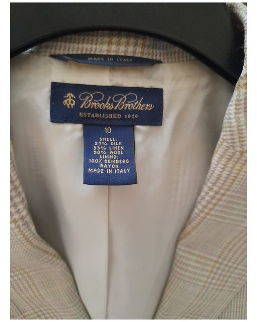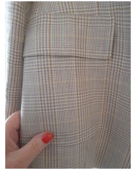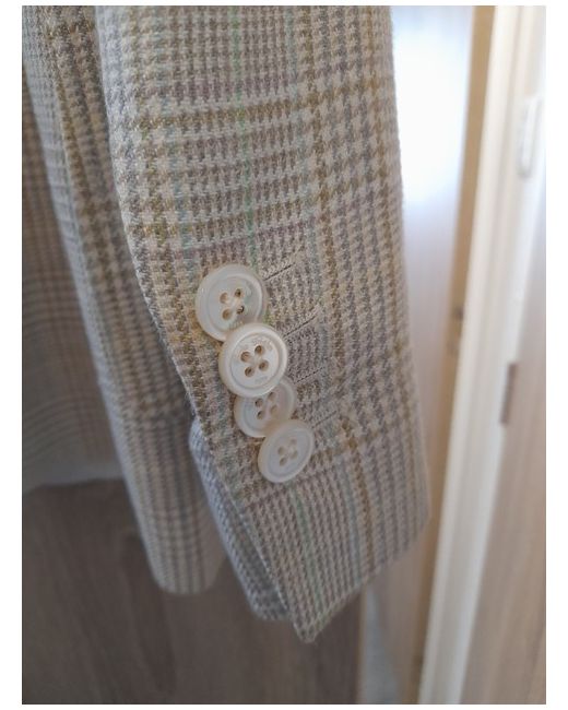 A beautiful jacket In natural materials: linen, wool and silk. A beige background with light coloured checks of blue and pink. Bought in America, never worn and in excellent condition. Attention to detail with 2 front pockets, mother of pearl buttons and the cuffs having buttons
