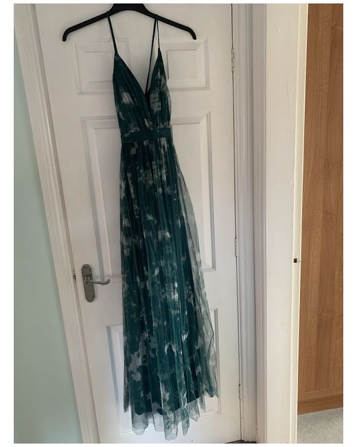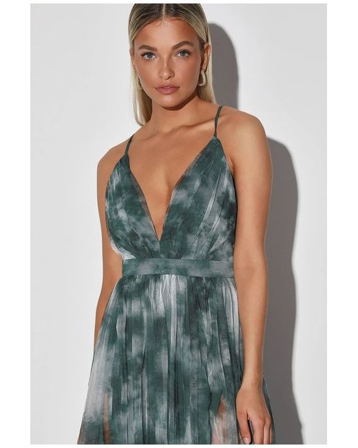 Lulus Elegant Moment Emerald Green Tie-Dye Backless Maxi Dress in size S. Brand new with tags. This gown features a sheer mesh design over a stretch knit liner, showcasing a green and white tie-dye print. The gathered bodice is styled with a plunging V-neckline and crisscross spaghetti straps over an open back. A banded empire waist accentuates the silhouette, flowing into a maxi skirt with two thigh-high slits. Finished with a hidden back zipper and clasp. Made from 100% polyester for both the shell and lining.