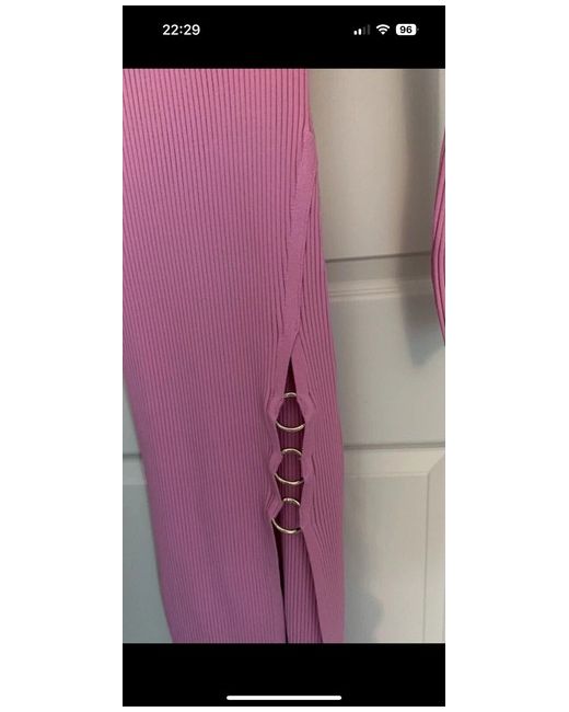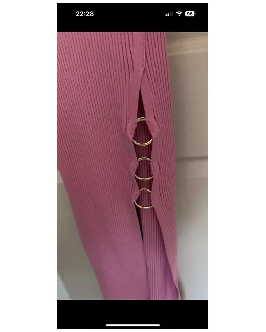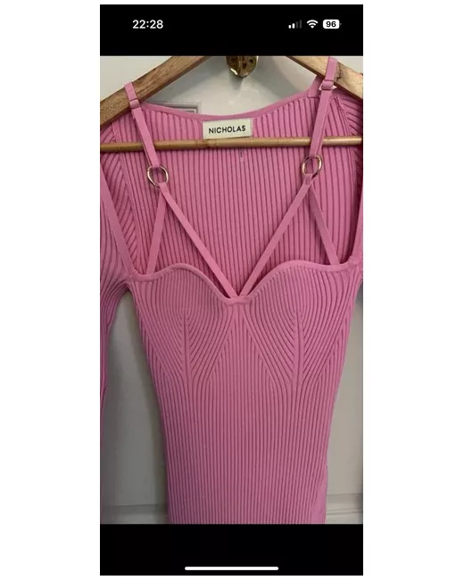 The photos do not do this dress justice. Search Nicholas Janet Ring Embellished dress to see images of dress on model. Bust detail and thigh split with gold rings. The dress has some stretch. I would say a uk 8-10. I bought the dress for £330.