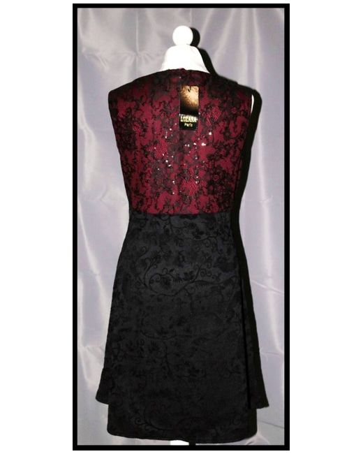 BNWT size 14 dress. Dress colour black and burgundy red with black lace and sequins also the front of dress has a black ribbon corset style to pull tight over cleavage. Ideal for an evening out. Dress length from mid shoulder to hem 37”.