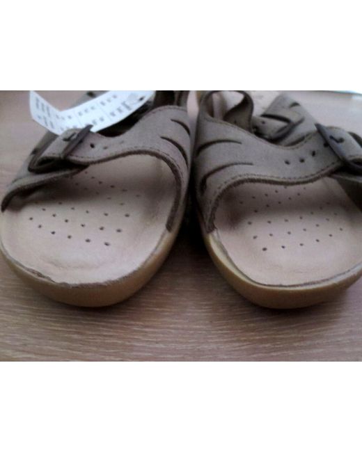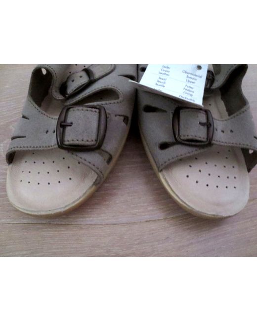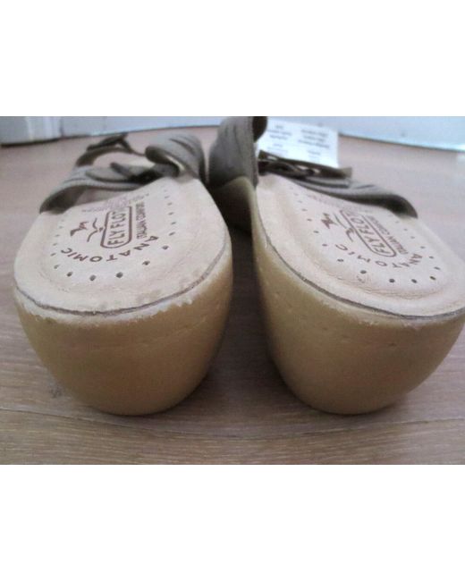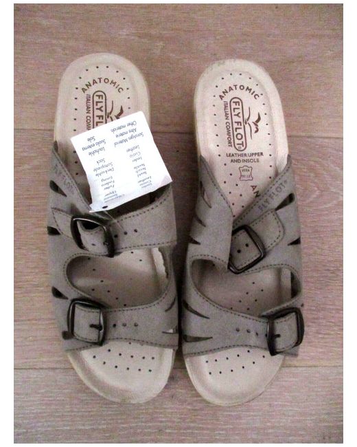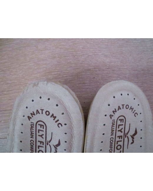 A pair of Beige wedge suede leather sandals from Fly Flot. The label on the sandals advises the sandals have leather uppers & insoles & textile lining & other materials for the sole. The sandals themselves say they are Anatomic Italian Comfort.